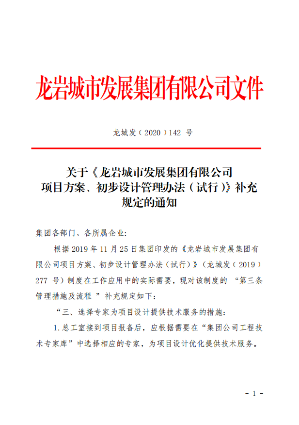 關于《龍巖城市發(fā)展集團 有限公司項目方案、初步設計管理辦法(試行)》補充規(guī)定的通知